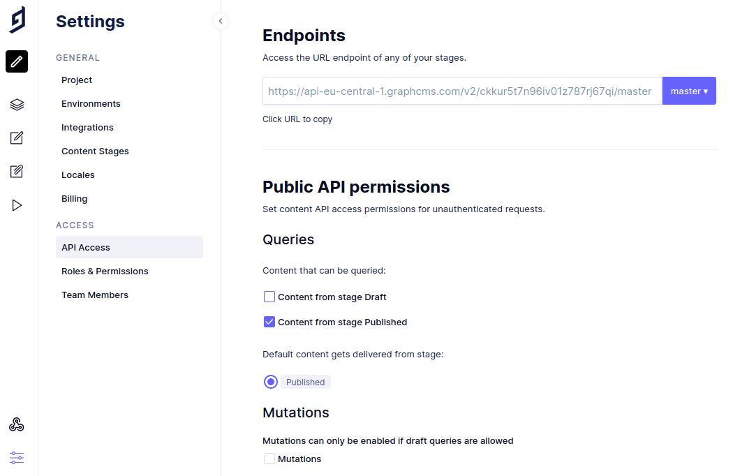 To use the GraphQL API externally, you would need to provide permission. Hygraph exposes an endpoint URL using which you can test the API calls using an external tool like Insomnia and GraphiQL.